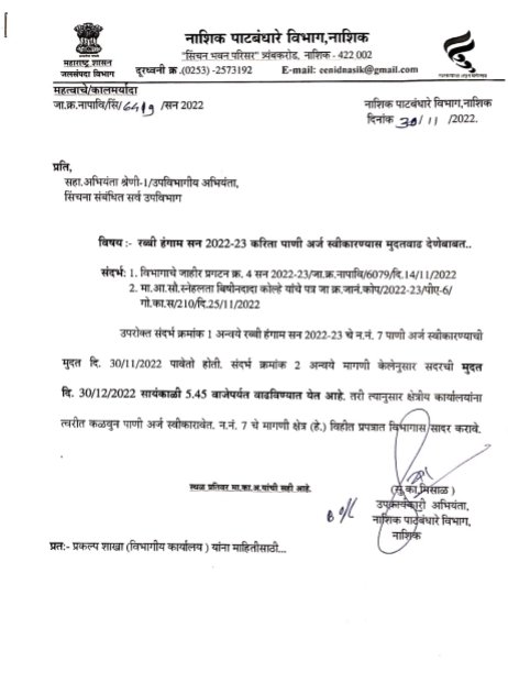 बारमाही गोदावरी कालवे लाभधारक शेतक-यांची सध्या रब्बी हंगामासाठीच्या शेती मशागतीची कामे सुरू असल्याने नाशिक पाटबंधारे विभागाने नमुना नंबर ७ वर पाणी मागणी अर्ज ३० नोव्हेंबर पर्यंत सादर करावे म्हणून प्रकटन प्रसिध्द केले होते त्यास मुदतवाढ मिळावी म्हणून आपण पत्रान्वये मागणी केली होती त्यास कार्यकारी अभियंता सागर शिंदे व उपकार्यकारी अभियंता सु.का.मिसाळ यांनी ३० डिसेंबर २०२२ पर्यंत मुदतवाढ दिली असुन त्याबाबतचे पत्र गोदावरी उजवा व डावा कालवा उपविभाग व शाखा कार्यालयांना पाठविले आहे.तरी जास्तीत जास्त शेतक-यांनी या वाढीव मुदतीचा लाभ घेवुन नमुना नंबर ७ वर पाणी मागणी नोंदवावी.गोदावरी कालवे सल्लागार समितीची बैठक निश्चित करून बारमाही गोदावरी कालवे सिंचन पाटपाणी आर्वतनांत येणा-या अडचणी दुर कराव्यात याबाबतही कार्यकारी अभियंता सागर शिंदे यांच्याशी चर्चा केली असल्याचे सौ. कोल्हे शेवटी म्हणाल्या.