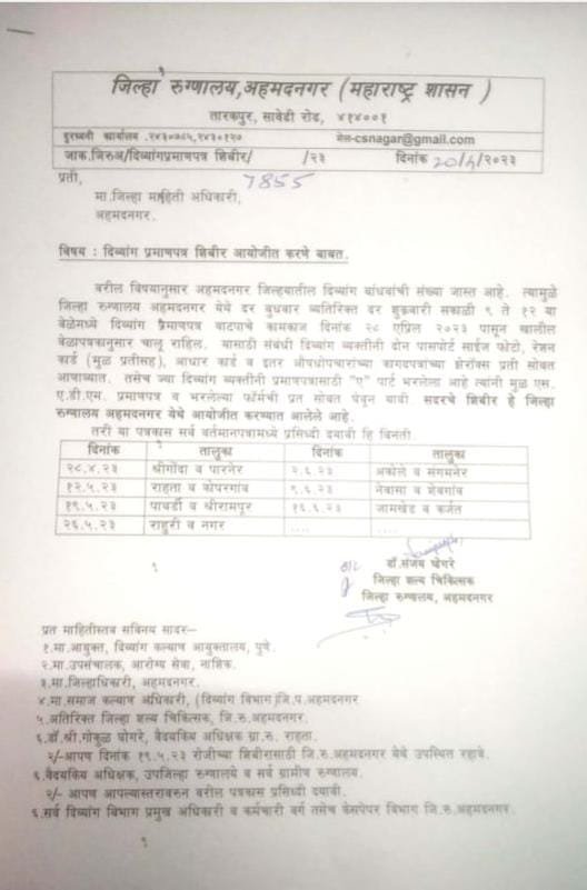 माजी राज्यमंत्री ओमप्रकाश उर्फ बच्चुभाऊ कडू यांच्या मार्गदर्शनाखाली प्रहार दिव्यांग क्रांती संघटने राज्याध्यक्ष बापुराव काणे साहेब यांच्या विनंती नुसार दिव्यांग बांधवांच्या तपासणी शिबिरासाठी अहमदनगर जिल्हा चिकित्सक मा.डॉ.संजयजी घोगरे साहेब यांच्याकडे मागणी केली होती.त्यानुसार अहमदनगर जिल्हा रुग्णालयाच्या वतीने कळविण्यात आले कि,जिल्ह्यातील 14 तालुक्यातील दिव्यांग बांधवांसाठी दिव्यांग प्रमाणपत्र तपासणी शिबीर अहमदनगर जिल्हा रुग्णालय येथे 28 एप्रिल पासून प्रत्येक शुक्रवारी तालुकानिहाय तपासणी करून प्रमाणपत्र देण्याचे आयोजन करण्यात आले आहे.अहमदनगर जिल्हा रुग्णालयात दर बुधवारी दिव्यांग प्रमाणपत्र तपासणी शिबीर होत असते परंतु जिल्ह्माचा विस्तार मोठा असल्याने व दिव्यांगांची संख्या भरपूर असल्याने दिव्यांगाची हेळसांड होऊ नये म्हणून तालुकानिहाय खालीलप्रमाणे अतिरिक्त तपासणी दिनांक 28/4/2023 रोजी श्रीगोंदा व पारनेर;12/5/2023 रोजी राहता व कोपरगाव;19/5/2023 रोजी पाथर्डी व श्रीरामपूर ;26/5/2023 रोजी राहुरी व नगर तालुका 2/6/2023 रोजी अकोले व संगमनेर;9/6/2023 रोजी नेवासा व शेवगाव ; तसेच 16/6/2023 जामखेड व कर्जत तालुक्यातील दिव्यांग तपासणी होणार आहे,तरी ज्या दिव्यांग बांधवांचे नवीन दिव्यांग प्रमाणपत्र काढणे बाकी आहे किंवा ज्यांना नवीन युनिक आयडी कार्ड मिळाले नाही अशा दिव्यांगांनी वरील तारखेप्रमाणे सकाळी 9 ते 12 या वेळेत अहमदनगर जिल्हा रुग्णालय येथे उपस्थित राहून या शिबिराचा लाभ घ्यावा.