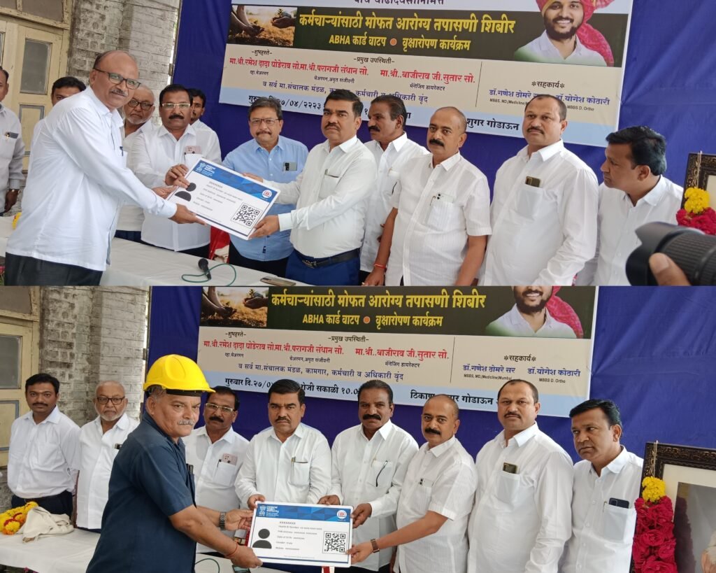 महाराष्ट्र राज्य सहकारी साखर संघाचे संचालक व सहकारमहर्षी शंकरराव कोल्हे सहकारी साखर कारखान्याचे युवा अध्यक्ष विवेकभैय्या कोल्हे यांच्या वाढदिवसानिमीत्त कारखाना कार्यस्थळावरील सर्व कर्मचा-यांची मोफत आरोग्य तपासणी करून कामगारांना शासनाचे आयूष्यमान भारत आरोग्य प्रमाणपत्राचे वाटप उपाध्यक्ष रमेश घोडेराव,अमृत संजीवनीचे अध्यक्ष पराग संधान,संचालक ज्ञानदेव औताडे,बापूसाहेब बारहाते,मनेष गाडे,राजेंद्र कोळपे,कार्यकारी संचालक बाजीराव सुतार,साखर सरव्यवस्थापक शिवाजीराव दिवटे छायाचित्रात दिसत आहे.