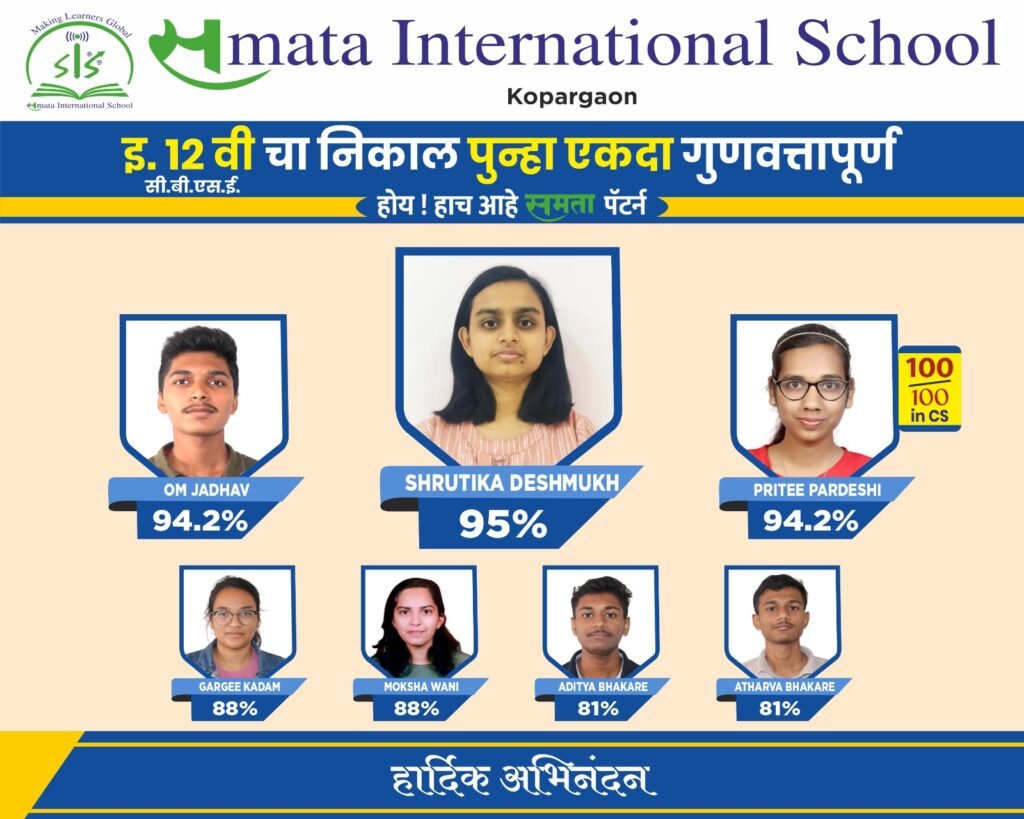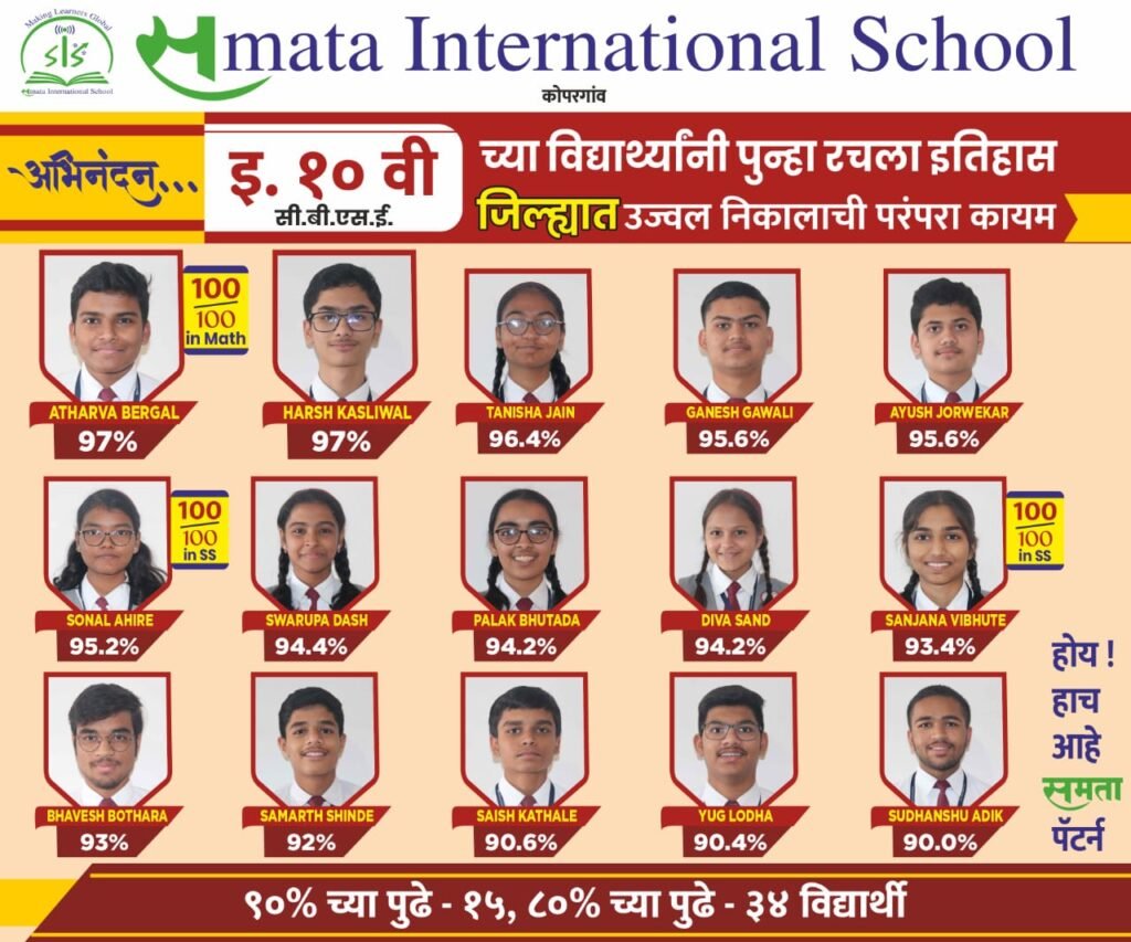 कोपरगाव सी.बी.एस.ई.चा २०२२-२३ चा इ.१० वी आणि इ.१२ वी चा निकाल नुकताच जाहीर झाला. त्यामध्ये समता इंटरनॅशनल स्कूलच्या विद्यार्थ्यांनी अहमदनगर जिल्ह्यात बाजी मारत उज्वल निकालाची परंपरा कायम राखली आहे. इ.१० वीत अथर्व बेरगळ आणि हर्ष कासलीवाल यांनी ९७ टक्के गुण मिळवुन स्कूलमध्ये प्रथम येण्याचा मान मिळविला तर तनिषा जैन हिने ९६.४ टक्के गुण मिळवत द्वितीय तर गणेश गवळी आणि आयुष जोर्वेकर यांनी ९५.४ टक्के गुण मिळवत तृतीय क्रमांक मिळविला तर इ.१२वीत श्रुतिका देशमुख हिने ९५ टक्के,ओम जाधव आणि प्रीती परदेशी यांनी ९४.२ तर गार्गी कदम हिने ८८ टक्के गुण मिळवत अनुक्रमे प्रथम,द्वितीय आणि तृतीय क्रमांक मिळवत दैदीप्यमान यश संपादन केले आहे.समता इंटरनॅशनल स्कूलचे या वर्षी सर्वच विद्यार्थी प्रथम श्रेणीमध्ये उत्तीर्ण होऊन समता पॅटर्न अहमदनगर जिल्ह्यात यशस्वी ठरत इ.१०वी आणि इ.१२वीचा समता स्कूलचा निकाल १०० टक्के लागला आहे.