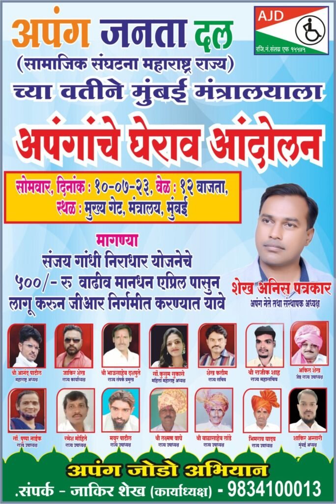 महाराष्ट्र राज्याचे मुख्यमंत्री मा.ना. एकनाथजी शिंदे व उपमुख्यमंत्री मा. ना.देवेंद्रजी फडणवीस यांच्या विभागाकडुन दिलेले आश्वासन पूर्ण केले नसल्याने,अपंग जनता दल, महाराष्ट्र राज्य या सामाजिक संघटनेचे संस्थापक अध्यक्ष मा.अनिसभाई शेख यांच्या मार्गदर्शनाखाली सोमवार दि.२७ मार्च २०२३ रोजी दिव्यांगांनी मंत्रालयासमोर आत्मदहन आंदोलनाची घोषणा केली त्यावेळी दिव्यांगांच्या मानधनात ५००रूपये वाढ करण्याचे दिलेले आश्वासन पूर्ण न केल्याने पुन्हा दिव्यांगांनी दि१० जुलै २०२३ रोजी मंत्रालयाला घेराव अंदोलनाची हाक दिली आहे.