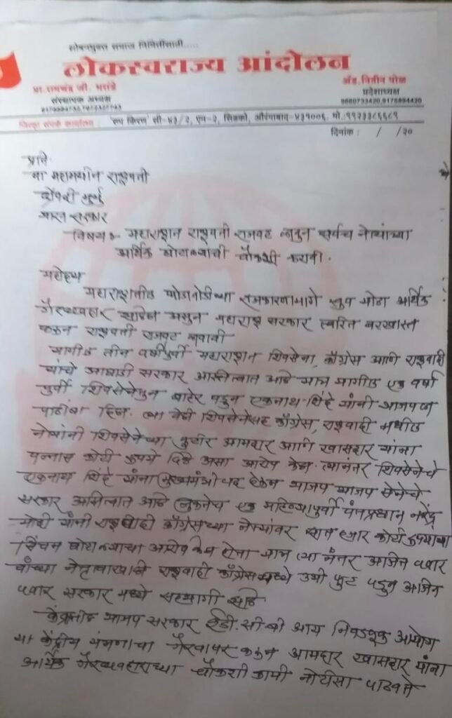 कोपरगाव :महाराष्ट्रातील फोडतोडीच्या राजकारणामागे खूप मोठा आर्थिक गैरव्यवहार झालेला असून महामयीम राष्ट्रपती यांनी महाराष्ट्र सरकार बरखास्त करून राष्ट्रपती राजवट लावावी व सर्वच राजकीय नेत्यांच्या आर्थिक घोटाळ्याची चौकशी करावी अशी मागणी लोक स्वराज्य आंदोलनाचे प्रदेश अध्यक्ष अँड.नितीन पोळ यांनी एका निवेदनाद्वारे देशाचे महामयीन राष्ट्रपती द्रौपदी मुर्मु यांना केली आहे.