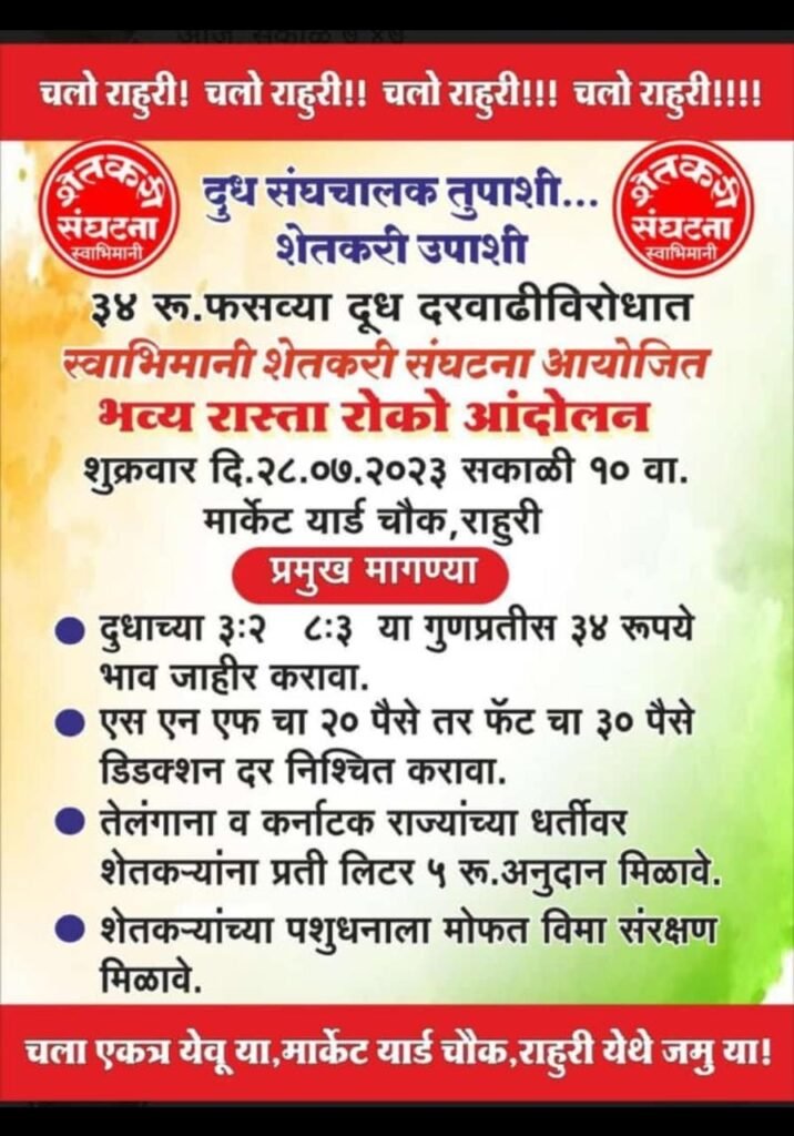 “दुध संघचालक तुपाशी… शेतकरी उपाशी “असे चालणार नाही या विरोधात व ३४ रूपये फसव्या दुध दरवाढी विरोधात स्वाभिमानी शेतकरी संघटना आयोजित भव्य रास्ता रोको आंदोलन शुक्रवार दि.२८ जुलै२०२३ रोजी सकाळी ठिक.१o वाजता मार्केट यार्ड चौक राहुरी येथे आयोजित केले आहे.