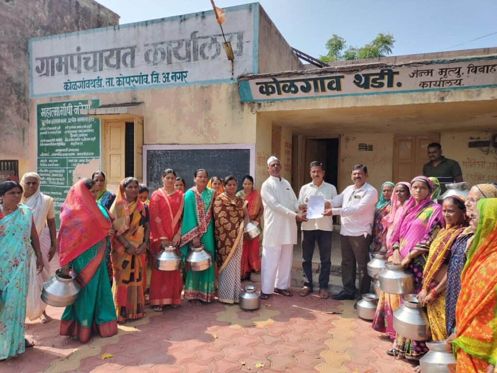 कोळपेवाडी येथील साखर कारखान्या शेजारी असलेल्या या गावात ग्रामपंचायतच्या गलथान व नियोजन शून्य कारभारामुळे कोळगावथडी गावचा पिण्याच्या पाण्याचा प्रश्न गंभीर बनला आहे.तरीही सरपंच व ग्रामपंचायत सदस्य व प्रशासन याकडे दुर्लक्ष करत आहे.त्यामुळे ग्रामस्थांमध्ये तीव्र असंतोष पसरला आहे.कोळगाव थडी गावातील पाण्याचा प्रश्न सोडविण्यासाठी तत्कालीन आमदार स्नेहलताताई कोल्हे यांनी शासन दरबारी सातत्याने पाठपुरावा करून मुख्यमंत्री ग्रामीण पेयजल योजनेतून कोळगाव थडी गावासाठी ५९ लाख ५१ हजार रुपयांची पाणीपुरवठा योजना मंजूर करवून आणली.मार्च २०१८ मध्ये ही पाणीपुरवठा योजना कार्यान्वित झाली.स्नेहलताताई कोल्हे यांच्या प्रयत्नामुळे गावचा पाणीप्रश्न सुटला व महिलांची पाण्यासाठी होणारी भटकंती थांबली.स्नेहलताताई कोल्हे यांनी पाणीपुरवठा योजना राबवून महिलांच्या डोक्यावरील हंडा उतरविण्याचे काम केले;पण विद्यमान सरपंच व ग्रा.पं.सदस्यांच्या ढिसाळ व नियोजनशून्य कारभारामुळे महिलांना पुन्हा डोक्यावर हंडा घेऊन पाण्यासाठी वणवण भटकण्याची वेळ आली आहे. मात्र,ग्रामपंचायतच्या नियोजनशून्य कारभारामुळे गावकऱ्यांना पुन्हा पाणीटंचाईची झळ बसू लागली आहे. गावात ३०ऑगस्टपासून पाणीपुरवठा बंद असल्याने ग्रामस्थ हैराण झाले आहेत.गावातील पाणीप्रश्नाकडे लक्ष वेधण्यासाठी बुधवारी (५ सप्टेंबर) ग्रामपंचायत कार्यालयावर हंडा मोर्चा काढण्यात आला.या मोर्चात पुंजाजी चिमाजी राऊत,नानासाहेब पंडोरे, शामराव मेहेरखांब,बाजीराव निंबाळकर,भिकचंद लुटे,पोपट निंबाळकर,बाजीराव महाले,राजाराम चंदर निंबाळकर, बाबासाहेब बाबुराव निंबाळकर,भास्कर मेहेरखांब, बाबासाहेब संपतराव निंबाळकर, दिनकर जाधव,वाल्मीक जाधव, कुर्मदास जाधव,किसनराव राऊत, अप्पासाहेब जाधव,वसंतराव वाकचौरे, माधव लुटे,शिवाजीराव चव्हाण, रावसाहेब कवडे,अनिल अंबेकर, गोरख पंडोरे,अनिल लुटे,राहुल राऊत, अनंता वाकचौरे,दीपक वाकचौरे, दीपक घुगरे, आकाश जाधव, बाबासाहेब गाडे,अलका निंबाळकर, पूनम अंबेकर,वत्सलाबाई राऊत, ज्योती जाधव,सुनंदा जाधव,शुभांगी राऊत,मीराबाई घाटकर,बेबीताई मेहेत्रे,अलका पंडोरे,सुमनबाई पंडोरे, अनिता कासार,चंद्रकला शहादे आदींसह ग्रामस्थ व महिला मोठ्या संख्येने सहभागी झाल्या होत्या.