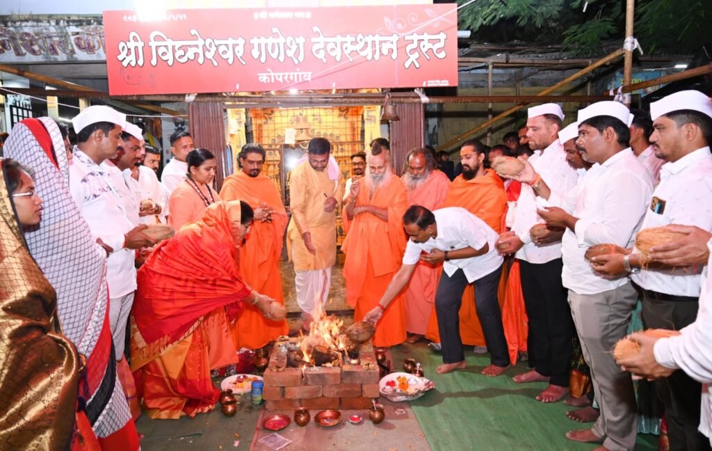 कोपरगाव विधानसभा मतदारसंघासह महाराष्ट्रात दुष्काळजन्य परिस्थिती निर्माण झाली आहे.गेल्या तीन महिन्यांपासून पावसाने दडी मारल्यामुळे खरीप हंगाम धोक्यात आला असून,कष्टकरी शेतकरी,व्यापाऱ्यांसह सर्वचजण पावसाची चातकासारखी वाट पाहत आहेत. दुष्काळाचे संकट टळण्यासाठी व चांगला पाऊस पडावा म्हणून संजीवनी युवा प्रतिष्ठानच्या वतीने प्रतिष्ठानचे संस्थापक अध्यक्ष युवा नेते विवेकभैय्या कोल्हे यांच्या मार्गदर्शना खाली गुरुवारी (७ सप्टेंबर) कोपरगाव शहरातील विघ्नेश्वर मंदिरात पर्जन्य महायज्ञ करण्यात आला.