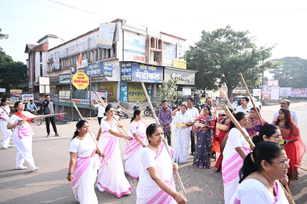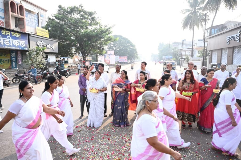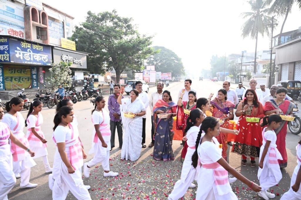 कोपरगाव : राष्ट्र सेविका समितीच्या वतीने शारदीय नवरात्रोत्सवाच्या निमित्ताने रविवारी (२२ ऑक्टोबर) कोपरगाव शहरात शानदार व शिस्तबद्ध पथसंचलन करण्यात आले. कोपरगाव विधानसभा मतदारसंघाच्या प्रथम महिला आमदार तथा भाजप नेत्या स्नेहलताताई कोल्हे यांनी शहरातील छत्रपती संभाजी महाराज सर्कल येथे या पथसंचलनात सहभागी झालेल्या सर्व महिला भगिनींचे पुष्पवृष्टी करून स्वागत केले.
