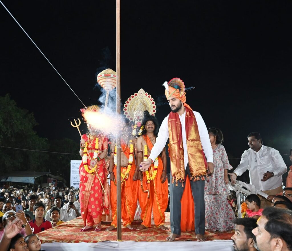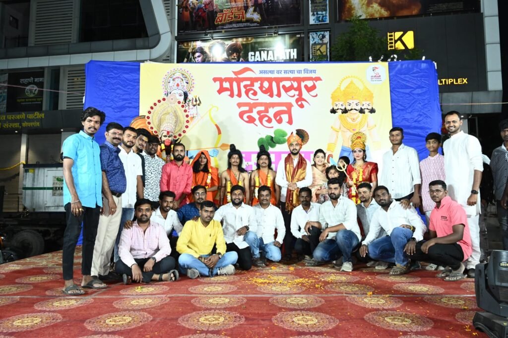 यावेळी युवा नेते विवेकभैय्या कोल्हे यांनी बजरंगबलीची गदा हातात उंचावून कोपरगाव मतदारसंघाच्या सर्वांगीण विकासाचा संकल्प सोडत विरोधकांना सूचक इशारा दिला. त्यावेळी उपस्थितांनी ‘विवेकभैय्या कोल्हे आगे बढो,हम तुम्हारे साथ है’ अशा घोषणा देत मोठा जल्लोष केला. या सोहळ्यात आकर्षक वेशभूषेत सहभागी झालेल्या कावेरी जालिंदर आढाव (महिषासुरमर्दिनी दुर्गा माता),अंकुश बाळासाहेब संत (प्रभू श्रीराम), श्वेता लोणारी (सीतामाता),लहू बाळासाहेब संत (लक्ष्मण),सतीश डुकरे (वीर हनुमान) या कलाकारांचे पूजन विवेकभैय्या कोल्हे व पराग संधान यांच्या हस्ते करण्यात आले.या कलाकारांसोबत फोटो व सेल्फी काढण्यासाठी मोठी गर्दी झाली होती. संजीवनी युवा प्रतिष्ठानने सलग दुसऱ्या वर्षी आयोजित केलेला हा महिषासुर दहन सोहळा संस्मरणीय ठरला.