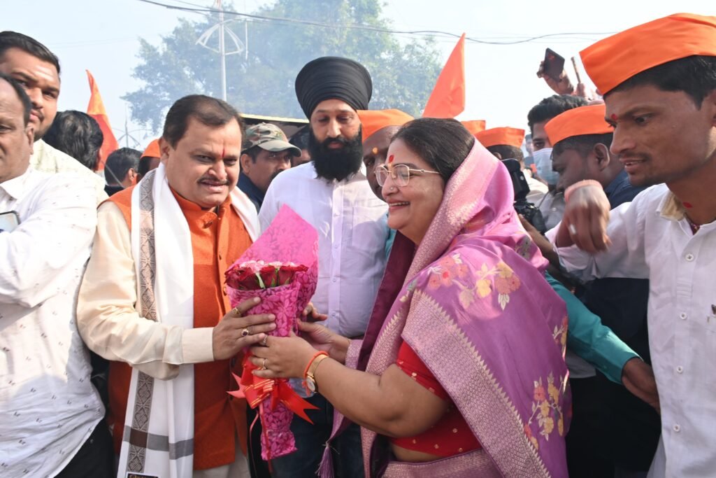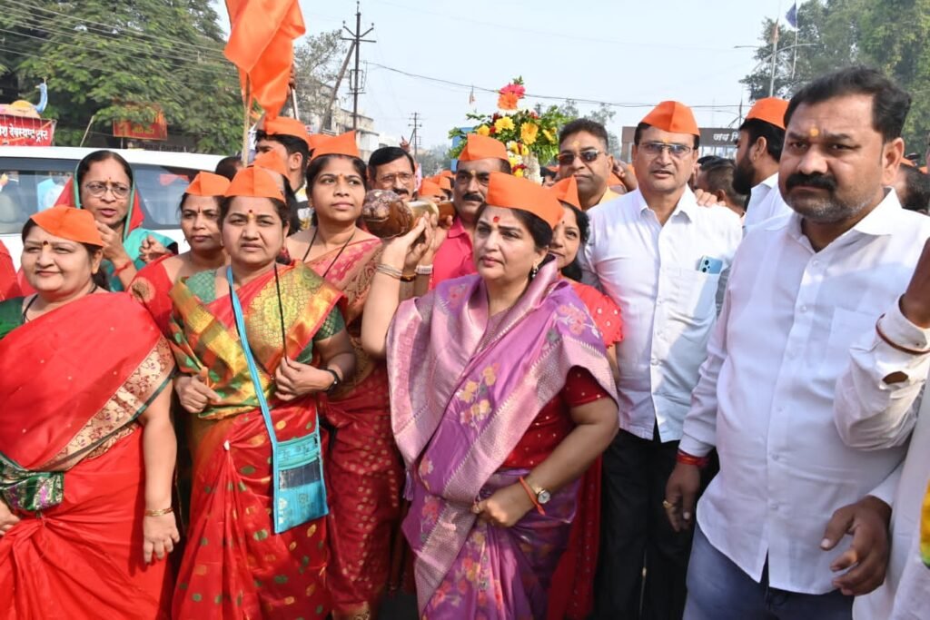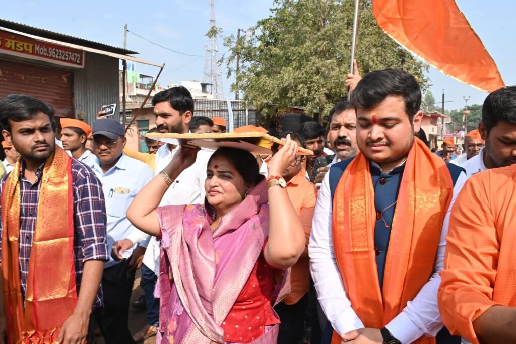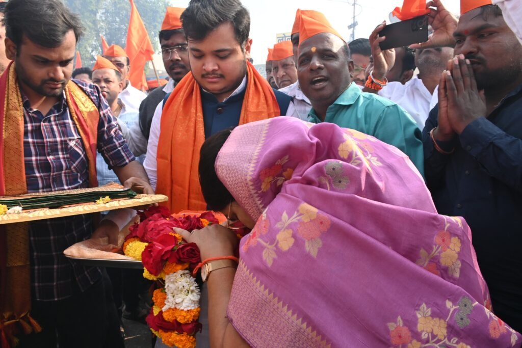 कोपरगाव : अयोध्या येथील नवनिर्मित श्रीराम मंदिरात २२ जानेवारी २०२४ रोजी प्रभू श्रीरामाच्या मूर्तीची प्राणप्रतिष्ठा होत असून,त्यानिमित्त सुदर्शन वाहिनीचे संपादक संचालक हिंदू धर्मयोद्धा सुरेश चव्हाणके यांच्या पुढाकारातून श्रीलंकेहून अयोध्येला निघालेल्या रामराज्य युवा यात्रेचे व प्रभू श्रीरामांच्या पादुकांचे बुधवारी (२७ डिसेंबर) सकाळी कोपरगाव शहरात आगमन झाले.यावेळी माजी आमदार स्नेहलताताई कोल्हे यांनी सकल हिंदू समाजाच्या वतीने या यात्रेचे स्वागत केले व प्रभू श्रीरामांच्या पादुकांचे विधिवत पूजन करून मनोभावे दर्शन घेतले.तद्नंतर त्यांनी शहरातून सवाद्य काढण्यात आलेल्या मिरवणुकीत सहभाग नोंदवला.श्रीरामाचा जयघोष करीत निघालेल्या या मिरवणुकीत असंख्य रामभक्त व सकल हिंदू समाजबांधव सहभागी झाले होते.