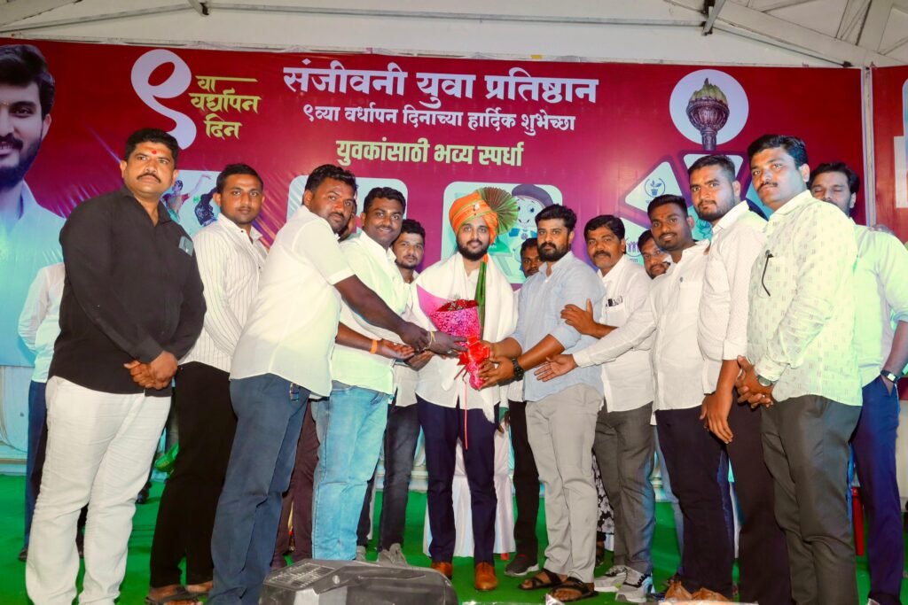 कोपरगाव : युवकांना हक्काचे व्यासपीठ उपलब्ध करून देत विविध नावीन्यपूर्ण उपक्रम राबवून सेवाकार्याच्या माध्यमातून संपूर्ण महाराष्ट्रात स्वत:ची वेगळी ओळख निर्माण केलेल्या कोपरगाव येथील संजीवनी युवा प्रतिष्ठानचा नववा वर्धापन दिन शुक्रवारी (१२ जानेवारी २०२४) कलश लॉन्स येथे मोठ्या उत्साहात व दिमाखात साजरा करण्यात आला. यानिमित्त प्रतिष्ठानचे संस्थापक अध्यक्ष युवानेते विवेकभैय्या कोल्हे यांच्या संकल्पनेतून युवकांसाठी वक्तृत्व,समूह,नृत्य,सोलो नृत्य व पोस्टर स्पर्धा घेण्यात आल्या.तसेच विविध क्षेत्रात उल्लेखनीय कामगिरी करून कोपरगाव शहर व तालुक्याचा नावलौकिक वाढविणाऱ्या कर्तृत्ववान व्यक्तींचा विवेकभैय्या कोल्हे यांच्या हस्ते सन्मान करण्यात आला.