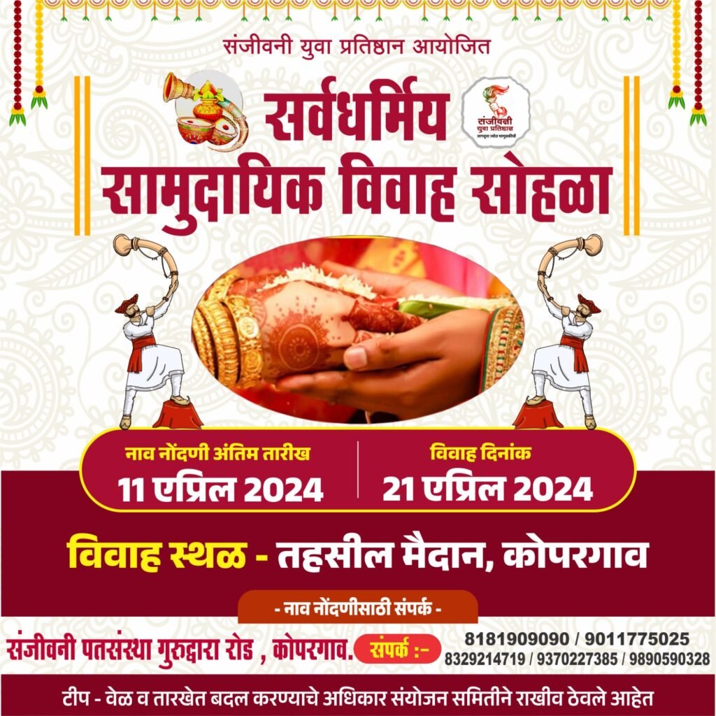 यावर्षीही संजीवनी युवा प्रतिष्ठानने २१ एप्रिल २०२४ रोजी सर्वधर्मीय सामुदायिक विवाह सोहळ्याचे आयोजन केले असून,यासाठी माजी आमदार स्नेहलताताई कोल्हे यांचे जनसंपर्क कार्यालय,संजीवनी सहकारी पतसंस्था,गुरूद्वारा रोड, कोपरगाव येथे नावनोंदणी सुरू आहे. नावनोंदणीची अंतिम तारीख ११ एप्रिल २०२४ ही आहे.ही नोंदणी नि:शुल्क असून,नोंदणीसाठी आधार कार्ड झेरॉक्स,शाळा सोडल्याचा दाखला,रहिवासी प्रमाणपत्र, रेशनकार्डची झेरॉक्स,दोन पासपोर्ट फोटो, .पालकांचे संमतीपत्र आवश्यक आहे.सर्व जाती-धर्मातील विवाहेच्छुक तरुण-तरुणींनी या सामूहिक विवाह सोहळ्याचा मोठ्या संख्येने लाभ घ्यावा.अधिक माहितीसाठी व नाव नोदंनीसाठी मो.८१८१९०९०९०, ९०११७७५०२५,८३२९२१४७१९, ९७०२२७३८५,९८९०५९०३२८ या क्रमांकावर संपर्क साधावा,असे आवाहन विवेकभैय्या कोल्हे यांनी केले आहे.