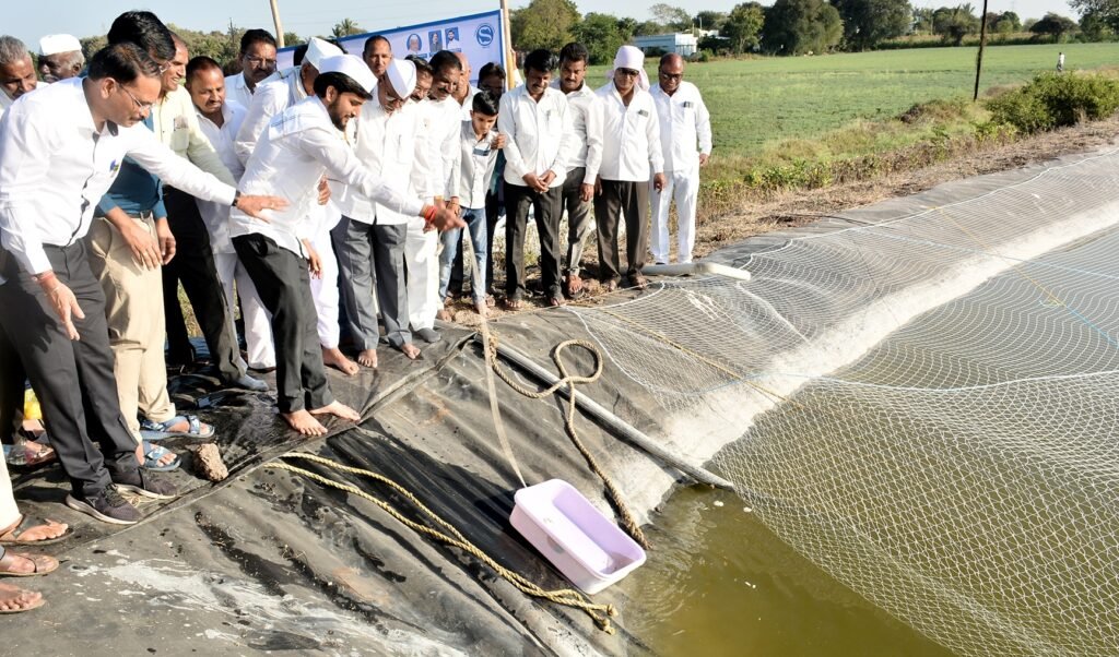 संजीवनी फार्मर्स फोरम व संजीवनी मत्स्य विकास सहकारी संस्थेच्या विद्यमाने संवत्सर परिसरात सहकारमहर्षी शंकरराव कोल्हे सहकारी साखर कारखान्याचे अध्यक्ष विवेकभैय्या कोल्हे यांच्या हस्ते संचालक बापूसाहेब बारहाते यांच्या शेततळयात मत्स्यबीज सोडुन शुभारंभ करताना.