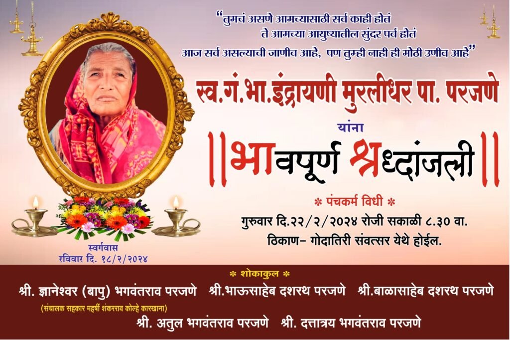 कोपरगाव : कळविण्यात अत्यंत वाईट वाटते कि,तालुक्यातील संवत्सर येथील स्व.गं.भा.इंद्रायणी मुरलीधर पा.परजणे यांना रविवार दि.१८ फेब्रुवारी २०२४ रोजी वयाच्या ८७ व्या वर्षी देवाज्ञा झाली त्यांचा पंचकर्म विधी (पाचव्या दिवशी) बुधवार दि.२२ फेब्रुवारी २०२४ रोजी ठिक.८ : ३० वाजता गोदातीरी संवत्सर येथे होईल याची सर्वांनी नोद घ्यावी.