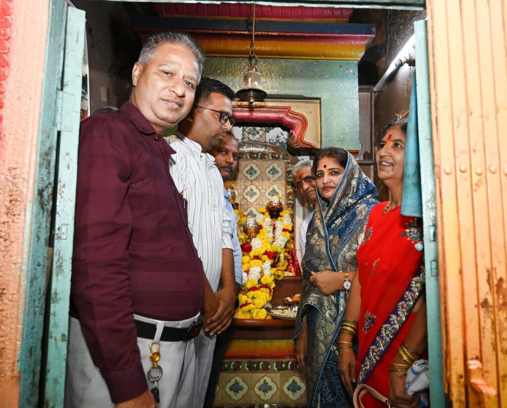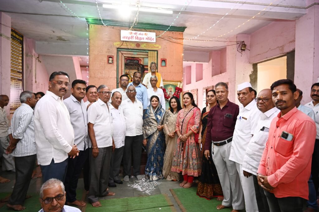 दरवर्षीप्रमाणे यावर्षीही श्री संत शिरोमणी नरहरी सोनार महाराज यांच्या पुण्यतिथीनिमित्त मंगळवारी कोपरगाव शहरातील पांडे गल्लीत असलेल्या श्री नरहरी-विठ्ठल मंदिरात विविध कार्यक्रमांचे आयोजन करण्यात आले होते.स्नेहलताताई कोल्हे यांनी संत नरहरी महाराज व श्री विठ्ठल मूर्तीला पुष्पहार अर्पण करून मनोभावे दर्शन घेतले.सर्व नागरिकांना सुख, समाधान,आनंदी व निरोगी आयुष्य लाभू दे,सर्वांच्या मनोकामना पूर्ण होऊ दे,सर्व अडचणींवर मात करून जनकल्याणासाठी काम करण्यास ऊर्जा मिळू दे,अशी प्रार्थना त्यांनी ‘श्रीं’च्या चरणी केली.यावेळी त्यांनी उपस्थित महिला व नागरिकांशी संवाद साधला.सुवर्णकार समाजाच्या वतीने महिला अध्यक्षा संगीता शहाणे व सुवर्णा भडकवाडे यांनी स्नेहलताताई कोल्हे यांचा सत्कार केला.