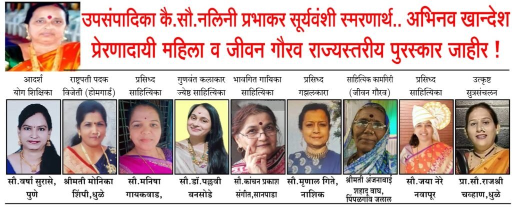 कोपरगाव : – कै.सौ.नलीनी प्रभाकर सूर्यवंशी उपसंपादिका धुळे यांच्या २७ जून हा स्मृतीदिनाच्या निमित्ताने गृहीणीपद सांभाळून विविध क्षेत्रात उल्लेखनीय कार्य करणार्या नारी शक्तीचा गौरव म्हणून ९ कर्तबगार महिलांना अभिनव खान्देश प्रेरणादायी व जीवनगौरव राज्यस्तरीय पुरस्कार आज जाहीर करण्यात आला असल्याची माहिती संस्थापक संपादक प्रभाकर सुर्यवंशी यांनी दिली आहे.
