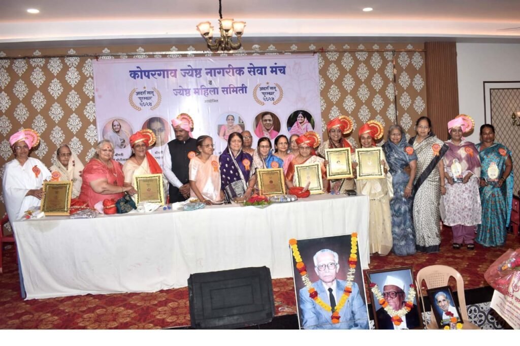 कोपरगाव येथील जेष्ठ नागरिक सेवा मंचच्या रौप्य महोत्सवी वर्षानिमित्त वार्षिक सभेच्या निमित्ताने समाजातील,”आदर्श सासू” सत्कार व शुभ विवाहानंतर अल्पावधीतच पती निधनानंतर संसार सांभाळून मुलांना मोठ करणाऱ्या मातांना शाल बुके सन्मानचिन्ह देऊन गौरविण्यात आले.