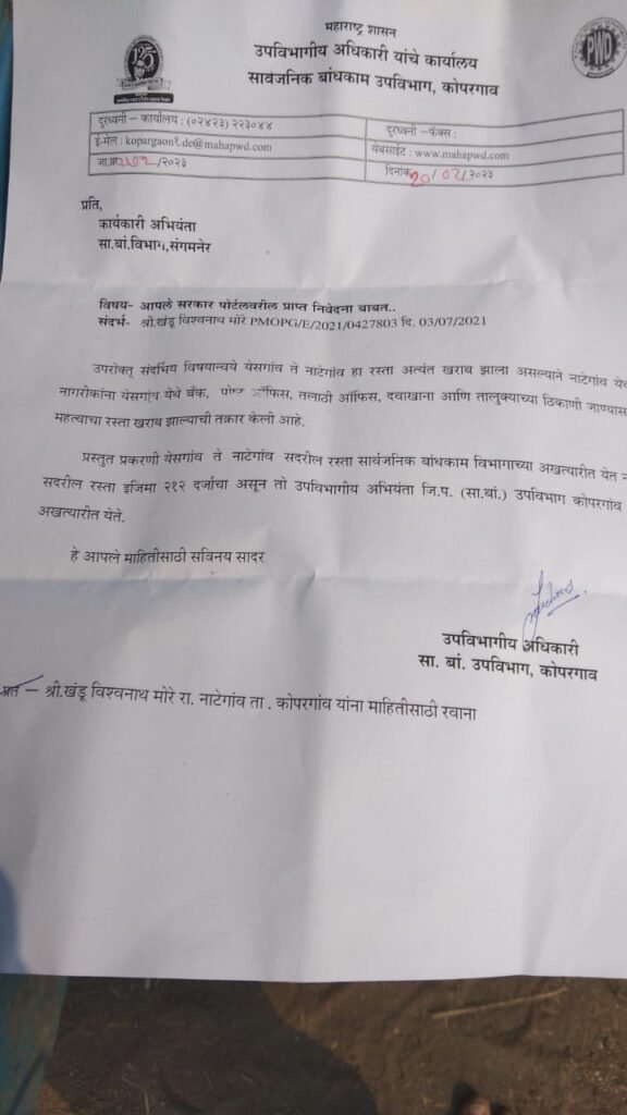 पुढे ते म्हणाले कि,उपविभागीय अधिकारी यांचे कार्यालय सार्वजनिक बांधकाम उपविभाग,कोपरगाव यांचेकडे आपले सरकार पोर्टलवर सदर नाटेगाव ते येसगाव हा रस्ता कोपरगाव तालुक्याच्या ठिकाणी दळणवळणाच्या दृष्टीने महत्वाचा असून दवाखाना,शाळा,कॉलेज, महाविद्यालये,शेतीची कामे,दु्ग्ध व्यवसाय तसेच विविध शासकीय कामासाठी तालुक्याला जोडलेला रस्ता असून सदर रस्ता प्रमाणापेक्षा जास्त खराब झालेला असून त्याचे पक्क्या रस्त्यात रूपांतर करण्यात यावे याबाबत दि.२०फेब्रुवारी २०२३ रोजी मागणी अर्ज दाखल केला होता त्यास संबधित अधिकारी यांनी सदर नाटेगाव ते येसगाव रस्ता हा सार्वजनिक बांधकाम उपविभागाच्या आखात्यारित येत नसून सदरील रस्ता हा प्रजिमा २१२ दर्जाचा असून तो उपविभागीय अभियंता जि.प.(सा.बा) उपविभाग बांधकाम आखत्यारित येत असल्याचा निर्वाळ देऊन संबंधितांनी आपली सोडवणूक करून घेऊन याकडे सपसेल दुर्लक्ष केल्याचे दिसत असल्याचे श्री.मोरे यांनी म्हटले आहे.