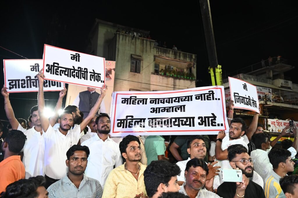 महिला नाचवायच्या नाही तर वाचवायच्या आहेत या आशयाचे फलक