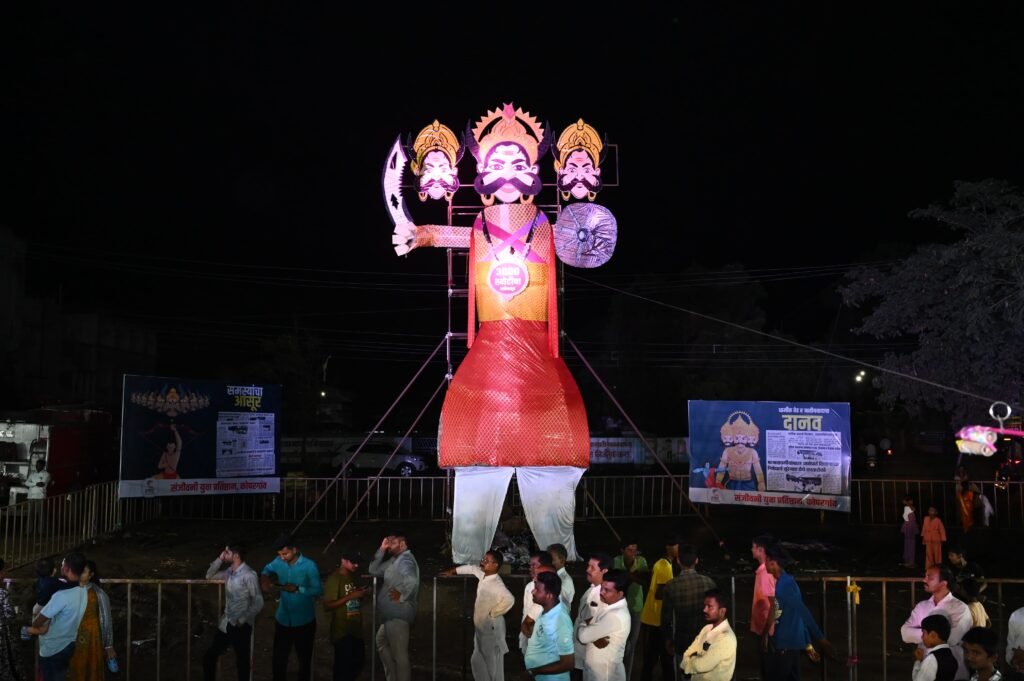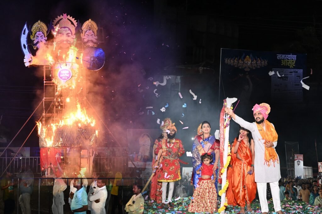 कोपरगाव : – संजीवनी युवा प्रतिष्ठान आयोजित महिषासुर दहन उपक्रमात नागरीकांना भेडसावणाऱ्या समस्यांना वाचा फोडण्यात आली.तीन हजार खोटी असे नाव देण्यात आले होते. नागरिकांनी जल्लोष करत युवानेते विवेकभैय्या कोल्हे व दैवतांची व महापुरुषांची वेशभूषा केलेल्या बाल कलाकारांच्या हस्ते सौ.रेणुकाताई कोल्हे यांच्यासह हजारो कोपरगावकरांच्या उपस्थितीत महिषासुर दहन पार पडले.