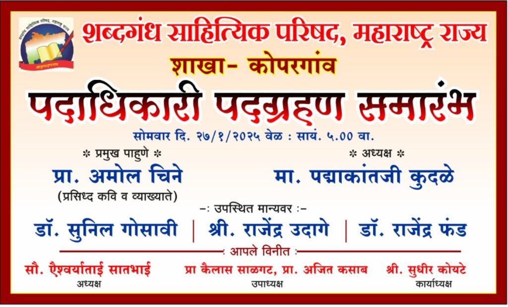 कोपरगाव – नवोदित साहित्यिकांना व्यासपीठ उपलब्ध करून देऊन पुस्तक प्रकाशन करण्यासाठी सदैव तत्पर असणारी शब्दगंध साहित्यिक परिषद, महाराष्ट्र राज्य कोपरगाव शाखेच्या नवनिर्वाचित पदाधिकारी पदग्रहण समारंभ सोमवारी सायंकाळी पाच वाजता आयोजित करण्यात आला असल्याचे अध्यक्षांच्या वतीने जाहीर करण्यात आले आहे.