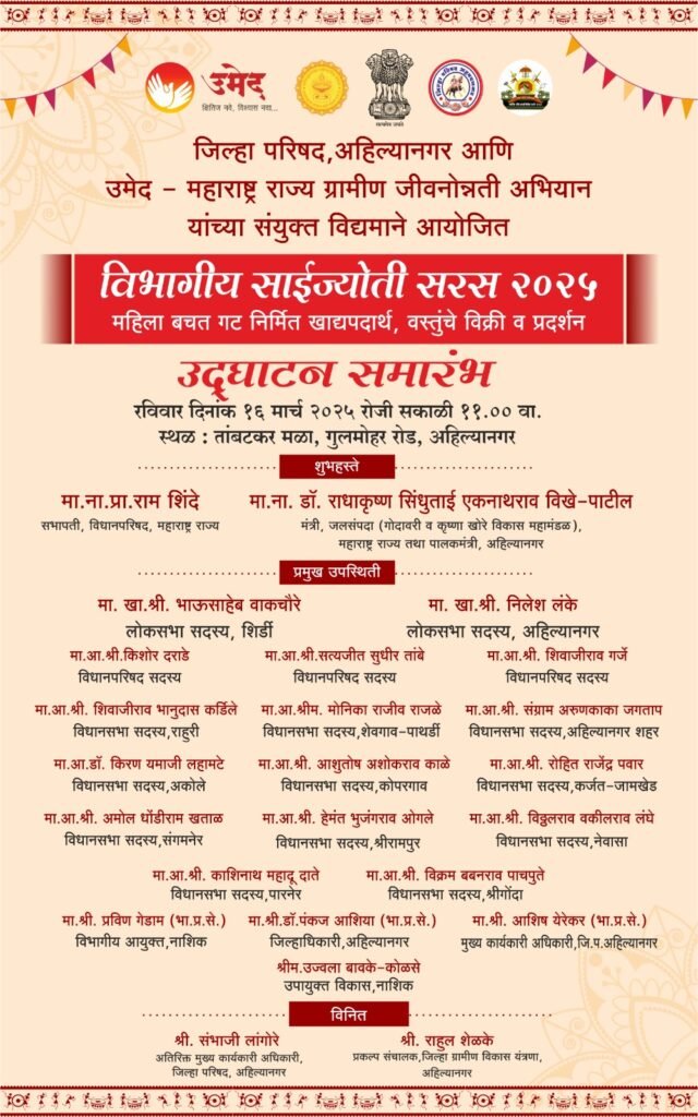 कोपरगाव : -बचत गटांच्या माध्यमातून महिलांचे जीवनमान उंचावण्यासाठी जिल्हा परिषद, अहिल्यानगर आणि उमेद – महाराष्ट्र राज्य ग्रामीण जीवनोन्नती अभियान यांच्या संयुक्त विद्यमाने महिला बचत गट निर्मित खाद्यपदार्थ वस्तुंचे विक्री व प्रदर्शनाचे आयोजन रविवार दिनांक १६ मार्च २०२५ रोजी सकाळी ११. ०० वा. तांबटकर मळा, गुलमोहर रोड, अहिल्यानगर या ठिकाणी करण्यात येणार आहे.