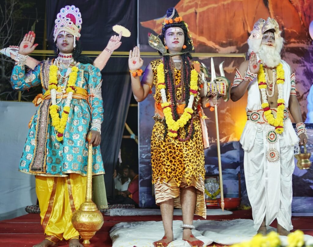 मुंबादेवी तरुण मंडळ साईगाव पालखीचे वतीने साध्वी अनुराधा दीदी पंढरपूरकर यांच्या रसाळ वाणीतून कोपरगाव येथे श्री शिव महापुराण कथा सुरू असून ब्रह्मा विष्णू महेश या पात्रांची सजावट करण्यात आली होती.