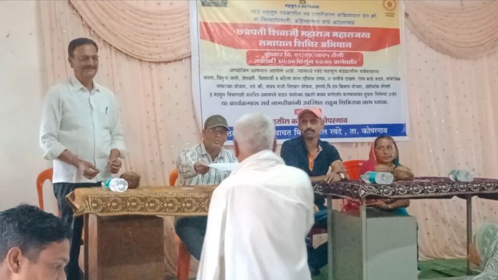 कोपरगाव : – मा.जिल्हाधिकारी साहेब अहिल्यानगर यांच्या आदेशान्वये, कोपरगाव तहसीलदार तथा तालुका दंडाधिकारी यांच्या अंतर्गत रवंदे मंडलाधिकारी मा.कैलास खाडे सो. याचे मार्गदर्शनाखाली मा.चंद्रशेखर कुलथे सो. यांच्या प्रमुख उपस्थितीत कोपरगाव तालुक्यातील महसुल व वन विभागांतर्गत दि. ९ जुलै रोजी रवंदे येथील ग्रामपंचायत हॉलमध्ये छत्रपती शिवाजी महाराज महाराजस्व समाधान शिबीराचे सकाळी ठिक १० ते दुपारी ३ वाजेपर्यंत आयोजन करण्यात आले होते, ज्यामध्ये १२ गांवांचा समावेश करण्यात आला होता. या शिबीरामध्ये विविध प्रकारच्या १३० दाखल्यांचे व प्रमाणपत्रांचे वाटप करण्यात आले.