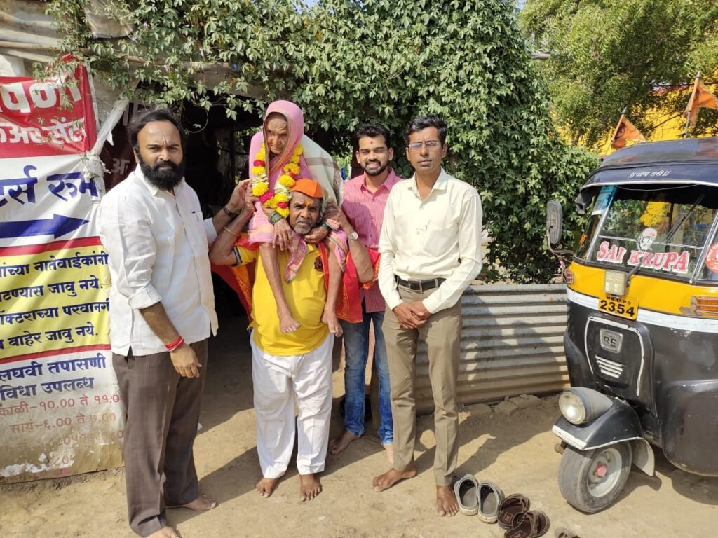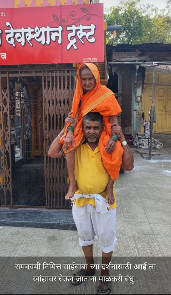 कोपरगावहून शिर्डीला आईला खांद्यावर घेऊन पायी जाणारे बबनराव जोगदंड आणि त्यांची आई जयाबाई यांची माजी नगराध्यक्ष मंगेशराव पाटील,सूर्यतेज संस्थापक व स्वच्छतादूत सुशांत घोडके,युवा सामाजिक कार्यकर्ते प्रणव वाणी, छायाचित्रकार शंतनु गुळस्कर यांनी भेट घेतली.या प्रसंगी त्यांचा शाल,हार,पेढे देऊन त्यांचा सन्मान करत दर्शन घेतले.