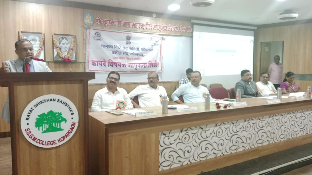 ते रयत शिक्षण संस्थेच्या श्री सद्गुरू गंगागीर महाराज सायन्स, गौतम आर्ट्स अँड संजीवनी कॉमर्स कॉलेज, कोपरगाव येथील ‘अंतर्गत तक्रार निवारण समिती’, ‘महिला मंच’, ‘ग्रीव्हन्स रीड्रेसल सेल’ यांच्या संयुक्त विद्यमाने व ‘विधी सेवा समिती’ च्या सहकार्याने आयोजित ‘कायदा जाणीव जागृती’ कार्यशाळेत बोलत होते.