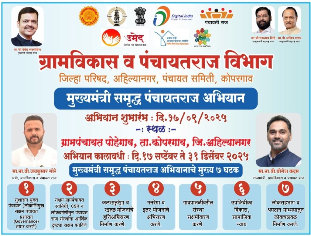 कोपरगाव : महाराष्ट्र शासनामार्फत मुख्यमंत्री समृद्ध पंचायतराज अभियान राबविण्यात येत असून या अभियानांतर्गत कोपरगाव तालुक्यातील 75 ग्रामपंचायतींचा समावेश करण्यात आला आहे. देशाचे पंतप्रधान माननीय श्री नरेंद्र जी मोदी साहेब यांच्या वाढदिवसाचे औचित्य साधून या अभियानास दि.१७ सप्टेंबर २०२५ पासून प्रभावीपणे सुरुवात होणार आहे सदर अभियान दि. ३१ डिसेंबर २०२५ पर्यंत चालणार आहे. या अभियानाचे मुल्यांकन जानेवारीमध्ये होऊन भरघोस बक्षीस दिली जाणार आहे. अशी माहिती मा. श्री. संदिप दळवी कोपरगाव गटविकास अधिकारी यांनी पत्रकार परिषदेमध्ये दिली.